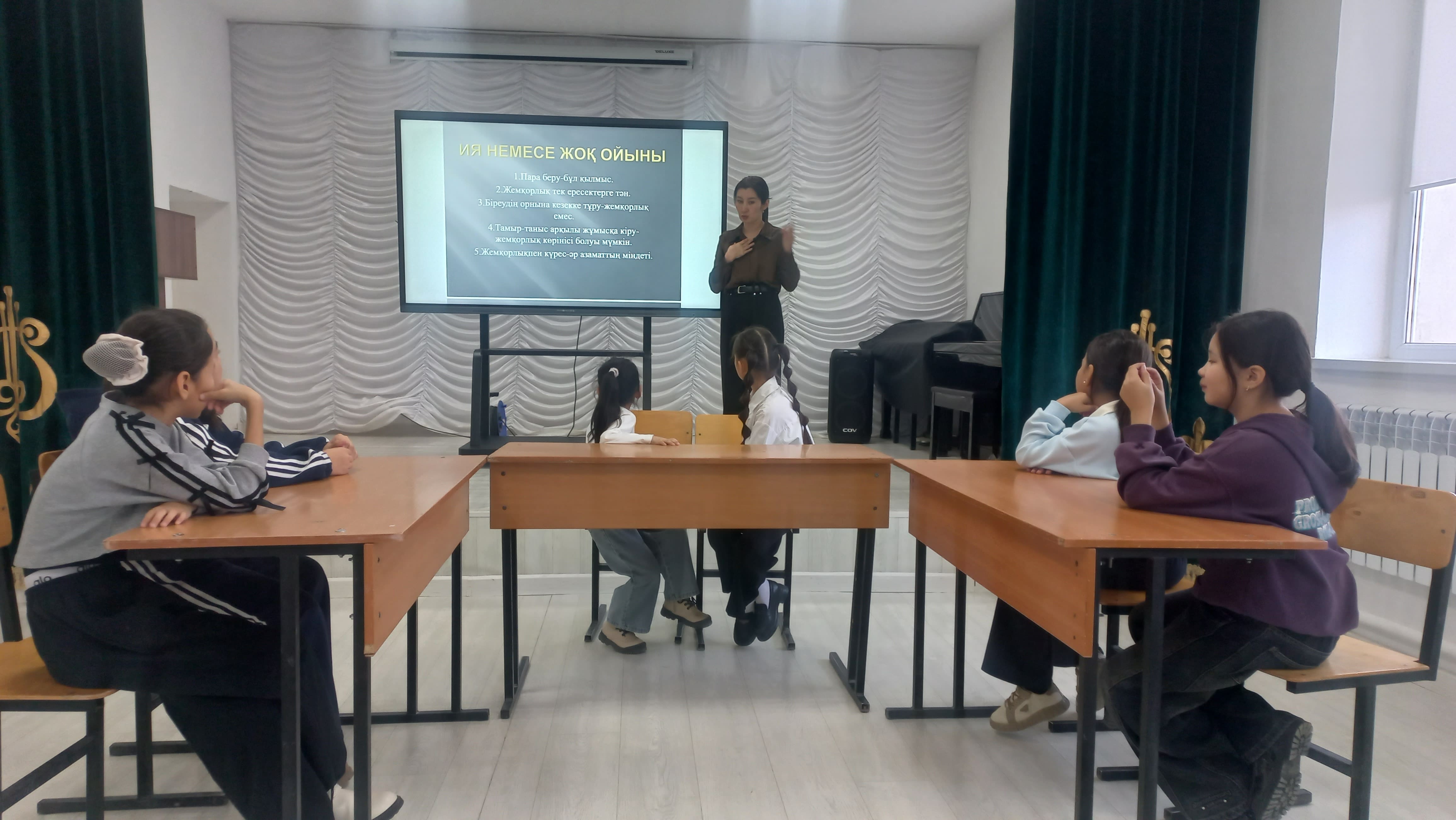 Құлшар Бақтыбайұлы атындағы Бейнеу балалар өнер мектебінде фортепиано сыныбының мұғалімі Сәуелова Айзаданың "Жемқорлық-қоғам дерті" тақырыбында тәрбие сағаты болды.